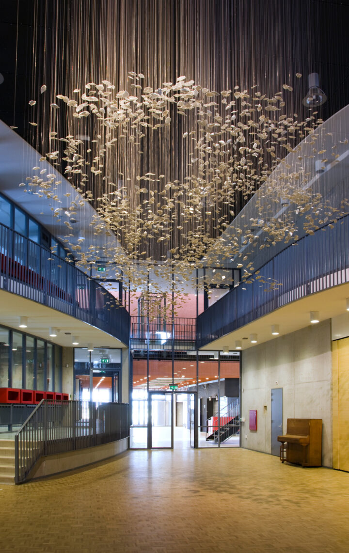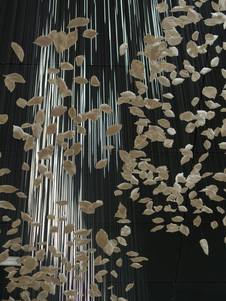 Each leave is a cast of real elm leaf, of which I collected some 3000 in the summer of 2006. These same leaves are now suspended by long wires from the ceiling, like porcelain fossils.