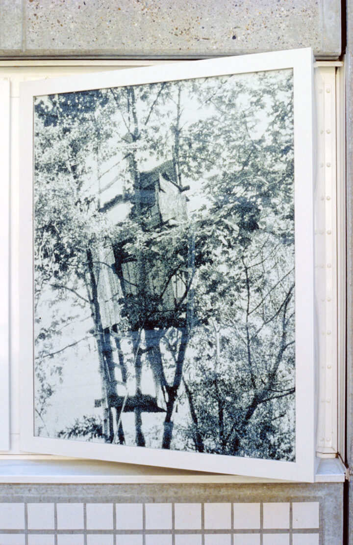 Behind the glass of this window is a picture of a tree hut. I remember tree huts as meeting places or places where you could hide as child and observe the surroundings unnoticed.