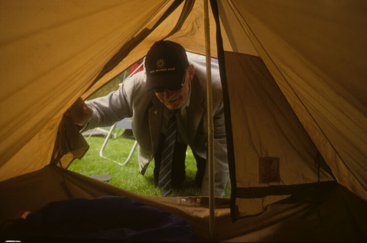 The holidaymakers are patients of the psychiatric hospital, who have temporarily converted the place where they spent most of their lives into a curious holiday resort. In their imagination they leave the grounds of the psychiatric hospital and look at their own surroundings as if they were tourists. And perhaps they are. What is it like to look at your own surroundings from inside the tent? Whenever you really left the facility? Many holiday snapshots have an alienating effect. Here, the holiday snapshot as a mixture of posing and documenting a spontaneous moment seems to be taken to its extreme.